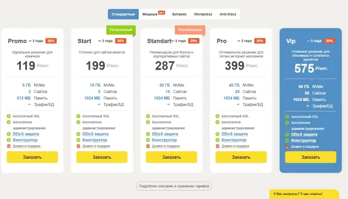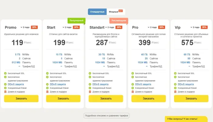 На всех тарифах виртуального хостинга доступно бесплатное тестирование возможностей в течение 7 дней. Затем нужно выбрать один из платных пакетов услуг. Всего их пять: